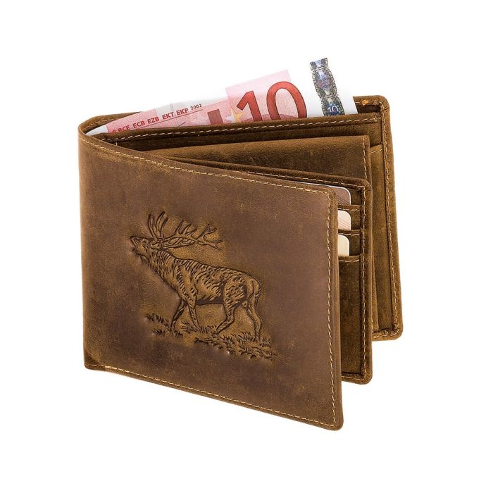 Deze handgemaakte billfold portemonnee met prachtig "Hirch" reliëf is een echte aanrader voor iedere jager en sportschutter! Leuk item om cadeau te geven. De leren portemonnee heeft een vak voor muntgeld, twee vakken voor papiergeld, een ID-kaart vak en zeven vakken voor creditcards.