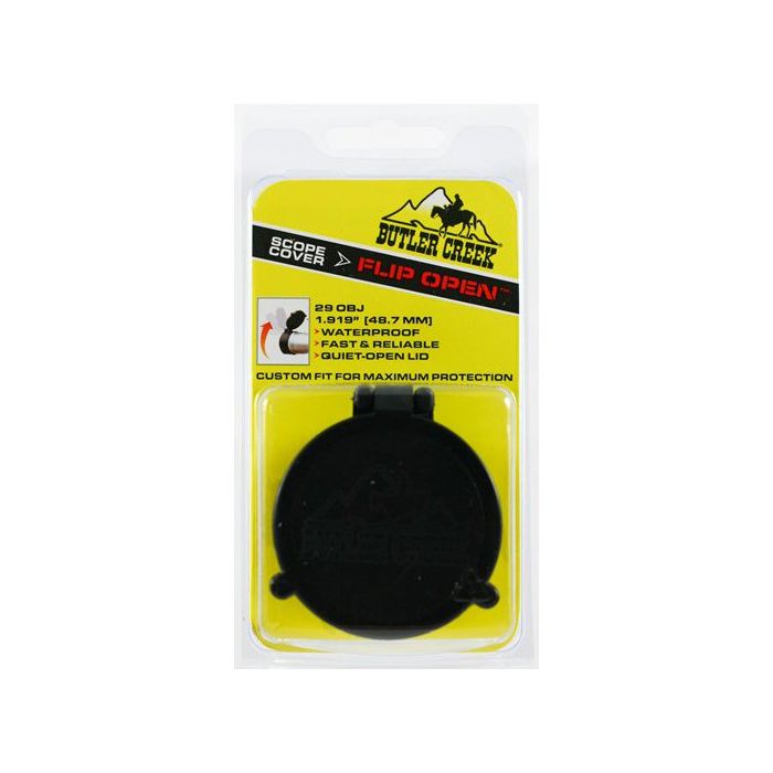 Butler Creek Flip Open Scope Cover Objectief #29. De Flip-up beschermkappen van Butler Creek zijn de beste manier om uw richtkijker te beschermen tegen vocht, vuil en stof. Eenvoudig en snel te openen door een lichte aanraking met uw duim zodat men direct een schot kan plaatsen zonder uw oog van het doel te halen. Zeer stille veer-scharnier zodat het wild niet zal opschrikken van geluid. Met O-ring voorzien om stof en vocht buiten te houden. Tot -40°C getest. Licht van gewicht.