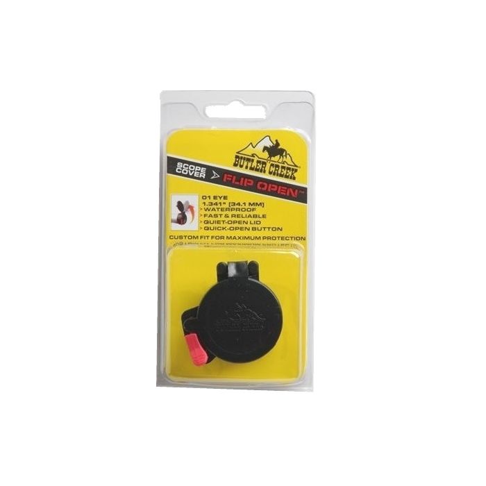 Butler Creek Flip-Up Scope Cover Eye (Oculair) . De Flip-up beschermkappen van Butler Creek zijn de beste manier om uw richtkijker te beschermen tegen vocht, vuil en stof. Eenvoudig en snel te openen door een lichte aanraking met uw duim zodat men direct een schot kan plaatsen zonder uw oog van het doel te halen. Zeer stille veer-scharnier zodat het wild niet zal opschrikken van geluid. Met O-ring voorzien om stof en vocht buiten te houden. Tot -40°C getest. Licht van gewicht.