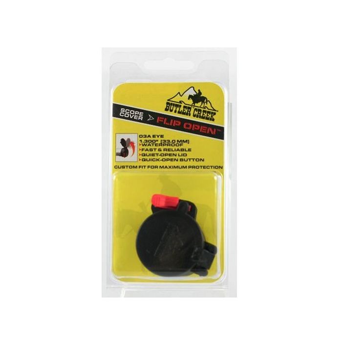 Butler Creek Flip-Up Scope Cover Eye (Oculair) . De Flip-up beschermkappen van Butler Creek zijn de beste manier om uw richtkijker te beschermen tegen vocht, vuil en stof. Eenvoudig en snel te openen door een lichte aanraking met uw duim zodat men direct een schot kan plaatsen zonder uw oog van het doel te halen. Zeer stille veer-scharnier zodat het wild niet zal opschrikken van geluid. Met O-ring voorzien om stof en vocht buiten te houden. Tot -40°C getest. Licht van gewicht.