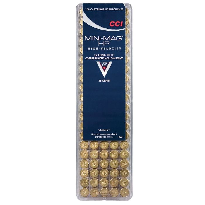 Kleinkaliber kogelpatronen. CCI Mini Mag Hollow Point .22 Long Rifle. De Mini-Mag was CCI's eerste randvuur product en blijft hun meest populaire. De CCI Mini Mag Hollow Point met zijn 36 Grain copper plated kogel-kop biedt uitstekende all-round prestaties voor de jacht op klein wild en ongedierte. Deze munitie is verder zeer geschikt voor training en gebruik voor wedstrijden. Het schoon verbrandende kruit zorgt voor het langer schoon blijven van het systeem om laadstoringen te voorkomen om zo langere schietsessies te houden met semi-automatische pistolen en geweren