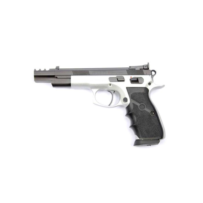 CZ Model 75 Champion Duo-Tone, kaliber 9 mm Para. Nieuwe CZ 75 Champion met verstelbaar target vizier. Het volledig stalen single action pistool heeft een geblauwde slede en satin nickel-finished greepstuk. De CZ Model 75 Champion is speciaal ontworpen voor IPSC wedstrijden in de Open Klasse. Geleverd in kunststof koffer plus reserve magazijn.