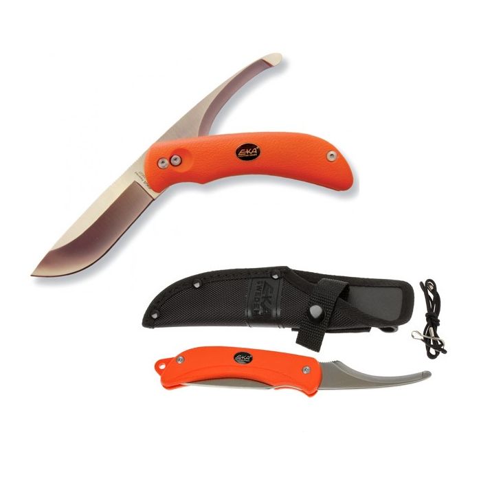 Het ultieme jachtmes dat perfect is voor het ontweiden van uw ree- en zwartwild. Met een druk op de knop keert het lemmet van een goed jachtmes in een perfect ontweid-mes. De rug van het ontweid-mes is stomp zodat de ingewanden niet kunnen beschadigen, terwijl het snijgedeelte super scherp is zodat u snel en gemakkelijk uw wild kunt ontweiden. Het lemmet is gemaakt van de staalkwaliteit Sandvik 12C27 gehard tot 57-59 HRC en de lengte van het mes is 9 cm en die van het ontweid-mes 8 cm. De non-slip handgreep ligt lekker in de hand en is verkrijgbaar in zwart of oranje. Ter voorkoming van het kwijtraken in de schemer in het veld is oranje heel handig. De EKA Swing-Blade wordt geleverd in een zwarte canvas foedraal die aan uw riem bevestigd kan worden. Het Zweedse bedrijf EKA-Knivar AB staat voor hoge kwaliteit en vele jaren vakmanschap en garandeert dat elk mes met zorg en precisie is vervaardigd en geeft dan ook 10 jaar garantie.