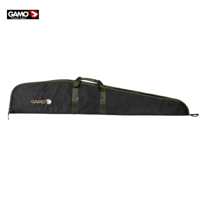 Gamo geweer foudraal in de kleuren zwart/groen met geborduurd "Gamo"embleem. Stevig nylon foudraal met zachte voering voor het veilig opbergen en vervoeren van een luchtbuks of kleinkaliber grendelgeweer met gemonteerde richtkijker. De geweertas heeft een sterke ritssluiting en is verder voorzien van een draagriem en lus voor het weghangen.