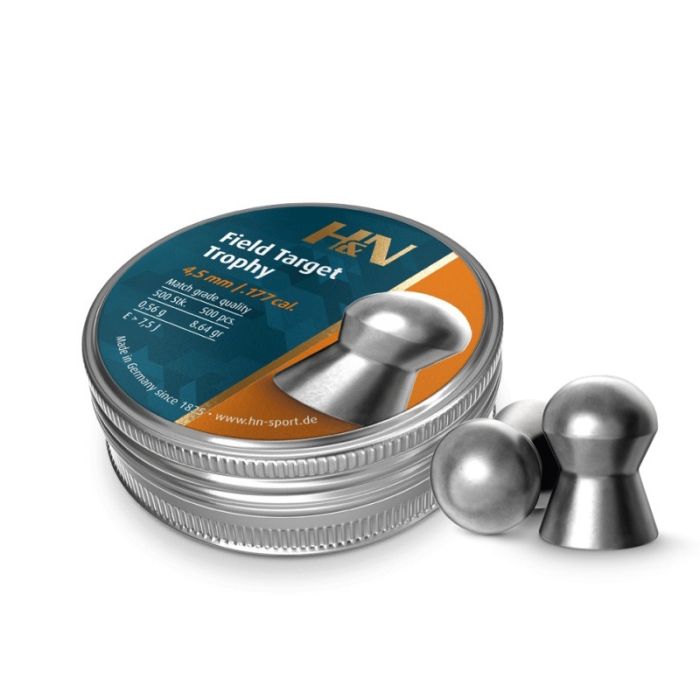 Haendler&Natermann luchtdrukkogeltjes Field Target Trophy kaliber 4,5 mm. Middelzwaar, hoge precisie wedstrijdkogeltje met zeer vlakke baan voor het schieten op middelgrote afstanden van 30 tot 50 meter. Uitzonderlijke aerodynamisch ontwerp voor hoge impact en doorslagkracht. Minste lood vervuiling en consistente geschoten groepjes door speciale legering en smering. Aanbevolen minimale mondingssnelheid: 7.5 Joule. Zeer geschikt voor de jacht, plinking, field target wedstrijden en hobbymatig schieten op kaartjes.