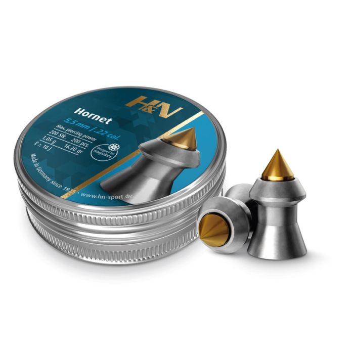 H&N Hornet luchtdrukkogel kaliber 5,5 mm met hoog doordringend vermogen. Met een gewicht van 1,05 gram is de Hornet 5,5 mm een middelzware, nauwkeurige jachtkogeltje voor het schieten op middellange afstanden. Door zijn ingebouwde messing punt heeft de Hornet een hoog doordringend vermogen en een verbeterde aerodynamica. Uitstekende uitzetting en hoge indringdiepte. Nauwkeurig kogeltje met gladde schacht en ingebauwde messing punt.