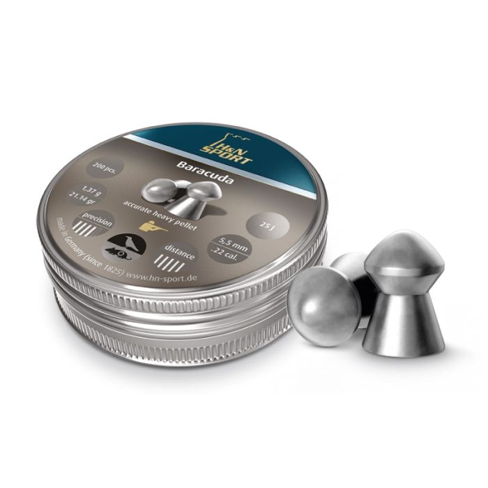 Heandler&Natermann Baracuda luchtdrukkogeltjes kaliber 5,5 mm. Zware, buitengewoon nauwkeurige jachtkogeltje voor het schieten op lange afstanden tot 50 meter en meer. Geavanceerde Baracuda ontwerp met beste aerodynamisch eigenschappen voor hoge impact en doorslagkracht en maximale penetratie. Gladde schacht met bolkop. Minste lood vervuiling en consistente geschoten groepen door middel van speciale legering en smering.