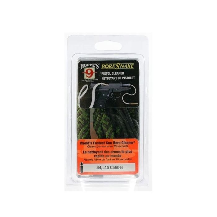 Hoppe's BoreSnake Pistol Cleaner. De BoreSnake reinigingskoord is een van de snelste manieren om een loop te reinigen. Met één keer doorhalen maakt de geïntegreerde bronzen borstel het vuil en aanslag los, waarna dit word opgenomen en afgevoerd door het gevlochten katoenen koord. Het gevlochten katoenen schoonmaakkoord heeft vele malen meer schoonmaak oppervlakte dan een standaard schoonmaakdoekje voor de loop, waardoor de loop in een veel kortere tijd goed kan worden gereinigd. Aan het uiteinde van de koord is een bronzen geleiding bevestigd waarmee de BoreSnake gemakkelijker door de loop gevoerd kan worden. De BoreSnake is uit-wasbaar waardoor de reinigingskoord steeds opnieuw kan worden gebruikt. De Hoppe's BoreSnake Pistol Cleaner is een zeer snel en gemakkelijk product om thuis, op de schietbaan of tijdens het jagen te worden gebruikt.