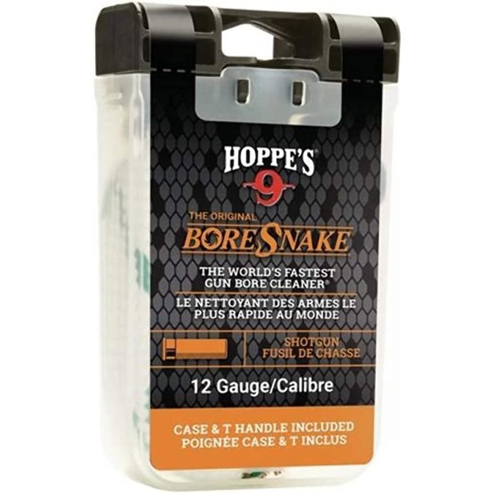 Hoppe's BoreSnake Shotgun Cleaner. De BoreSnake reinigingskoord voor hagelgeweren is een van de snelste manieren om een loop te reinigen. Met één keer doorhalen maakt de geïntegreerde bronzen borstel het vuil en aanslag los, waarna dit word opgenomen en afgevoerd door het gevlochten katoenen koord. Het gevlochten katoenen schoonmaakkoord heeft vele malen meer schoonmaak oppervlakte dan een standaard schoonmaakdoekje voor de loop, waardoor de loop in een veel kortere tijd goed kan worden gereinigd. Aan het uiteinde van de koord is een bronzen geleiding bevestigd waarmee de BoreSnake gemakkelijker door de loop gevoerd kan worden. De BoreSnake is uit-wasbaar waardoor de reinigingskoord steeds opnieuw kan worden gebruikt. De Hoppe's BoreSnake Shotgun Cleaner is een zeer snel en gemakkelijk product om thuis, op de schietbaan of tijdens het jagen te worden gebruikt.