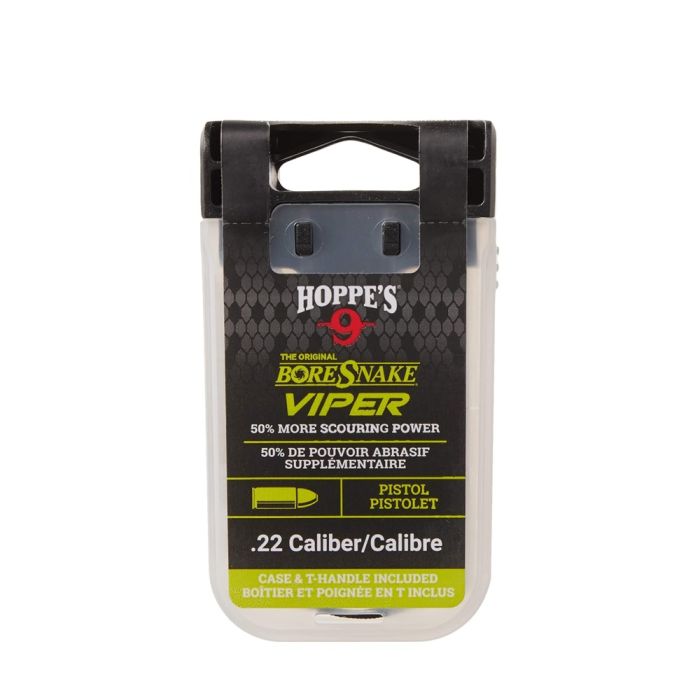 Hoppe's Viper BoreSnake Pistol Cleaner is een verbeterde versie van de standaard BoreSnake. De Viper is 50% krachtiger waardoor men op eenvoudige en snelle manier een loop kan reinigen. De upgrade versie van de Boresnake heeft nu drie in plaats van twee schoonmaak borstels en een ingebouwde kunststof loopgeleiding om nog gemakkelijker het koord door de loop te kunnen trekken. De Viper BoreSnake is een van de snelste manieren om een loop te reinigen. Met een keer doorhalen maakt de geintegreerde bronzen borstel het vuil en aanslag los, waarna dit word opgenomen en afgevoerd door het gevlochten katoenen koord. Het schoonmaakkoord heeft vele malen meer schoonmaak oppervlakte dan een standaard schoonmaakdoekje voor de loop, waardoor de loop in een veel kortere tijd goed kan worden gereinigd. Aan het uiteinde van de koord is een geleiding bevestigd waarmee de Viper BoreSnake gemakkelijker door de loop gevoerd kan worden. De BoreSnake reinigingskoord is uit-wasbaar en steeds opnieuw te gebruiken. De Viper Pistol Cleaner is een zeer snel en gemakkelijk product om thuis, op de schietbaan of tijdens het jagen te worden gebruikt.