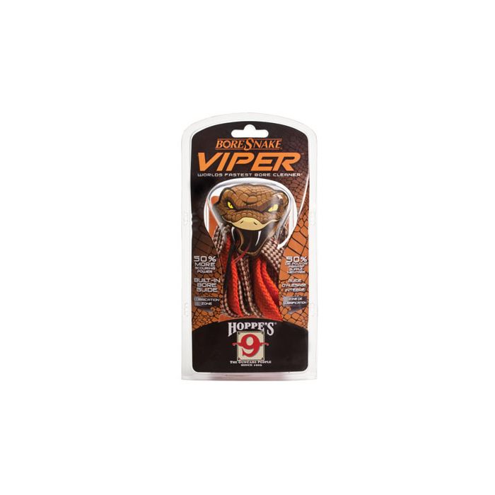 Hoppe's Viper BoreSnake Shotgun Cleaner is een verbeterde versie van de standaard Shotgun BoreSnake. De Viper is 50% krachtiger waardoor men op éénvoudige en snelle manier een loop kan reinigen. De upgrade versie van de Boresnake heeft nu drie in plaats van twee schoonmaak borstels en een ingebouwde kunststof loopgeleiding om nog gemakkelijker het koord door de loop te kunnen trekken. De Viper BoreSnake is een van de snelste manieren om een loop te reinigen. Met één keer doorhalen maakt de geïntegreerde bronzen borstel het vuil en aanslag los, waarna dit word opgenomen en afgevoerd door het gevlochten katoenen koord. Het schoonmaakkoord heeft vele malen meer schoonmaak oppervlakte dan een standaard schoonmaakdoekje voor de loop, waardoor de loop in een veel kortere tijd goed kan worden gereinigd. Aan het uiteinde van de koord is een geleiding bevestigd waarmee de Viper BoreSnake gemakkelijker door de loop gevoerd kan worden. De BoreSnake reinigingskoord is uit-wasbaar en steeds opnieuw te gebruiken. De Viper Shotgun Cleaner is een zeer snel en gemakkelijk product om thuis, op de schietbaan of tijdens het jagen te worden gebruikt.