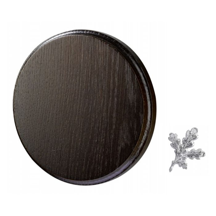 Keiler trofeeën-schild van donker gebeitst eikenhout met een doorsnede van 20 centimeter inclusief eikenblad afdekplaatje.