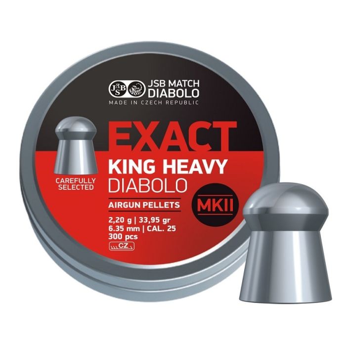 JSB Exact King Heavy Diabolo MKII kaliber 6,35mm. Zwaar, hoge kwaliteit luchtdrukkogeltje. Door zijn zwaardere gewicht, bolkop vorm, perfecte balans en gewichtsverdeling zorgen voor een zeer accuraat en stabiele vlakke baan. JSB Exact King Heavy Diabolo MKII kogeltjes zijn geschikt voor de iets krachtigere PCP luchtdrukwapens boven de 16 Joule voor het schieten op korte maar ook op de langere afstanden van 50 meter en meer. Alle JSB Exact Diabolo luchtdrukkogeltjes ondergaan een extra kwaliteit controle en worden met de hand gesorteerd, dit zorgt voor nog kleinere toleranties en dus hogere nauwkeurigheid. De op maat uitgezochte kogeltjes zorgen voor een perfecte passing in de loop. De kogeltjes passen in alle luchtdrukwapens met een kaliber van 6,35 mm. De JSB Exact King Heavy Diabolo MKII 6,35mm zijn van hoge kwalitatief, zeer nauwkeurige en uiterst geschikt voor de sportieve en recreatieve Field Target schutter, jagers en liefhebbers van PCP luchtbuksen.