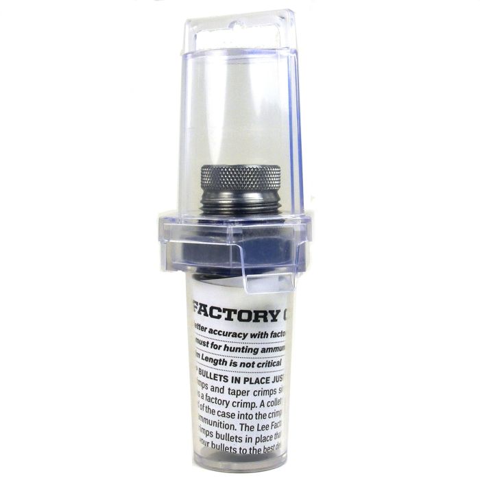 Lee Factory Crimp Die krimpt de kogelpunten op zijn plaats door een 4-delig binnenwerk dat voorzichtig, maar stevig knijpt aan het einde van de hulsmond, precies hetzelfde als bij fabrieks munitie. Geeft een gesegmenteerde rechte krimp en krimpt steviger dan enig ander gereedschap verkrijgbaar. Een stevige krimp verbetert de nauwkeurigheid, omdat de druk naar een hoger niveau opbouwt voordat de kogel begint te bewegen. Deze hogere startdruk verzekert een meer uniforme druk curve en minder snelheid variatie.