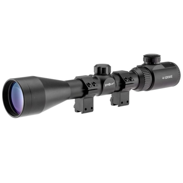 Lensolux 4-12x50E/WA (Wide Angle) richtkijker met variabele vergroting, 50 mm objectief. De allrounder voor gebruik bij zonsondergang, maar ook voor kleinere doelen op grotere afstand. De groothoekfunctie (Wide Angle) geeft u een breder gezichtsveld dan vergelijkbare lenzen. Verlicht Mil-Dot draadkruis, dimbaar in 11 niveaus van helderheid. Met stabiele 4-bout aluminium Weaver montage (21,5 mm). Richtkijker is van geanodiseerd aluminium en is stikstof gevuld tegen inwendig beslaan. Met fijn verstelbare oculair. De ideale richtkijker voor op een luchtdrukwapen of kogelgeweer voor de jacht. De Lensolux 4-12x50E heeft een buisdiameter van 30 mm en een lengte van circa 335 mm. Inclusief montage plus reserve batterij CR 2032. Shock getest!