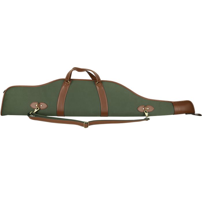 Maremmano jacht-kogelbuks, luxe geweer foudraal Old English Country Style, handgemaakt van groen canvas met lichtbruin gekleurd leder. Geschikt voor geweren met een totaallengte tot 123 cm.
