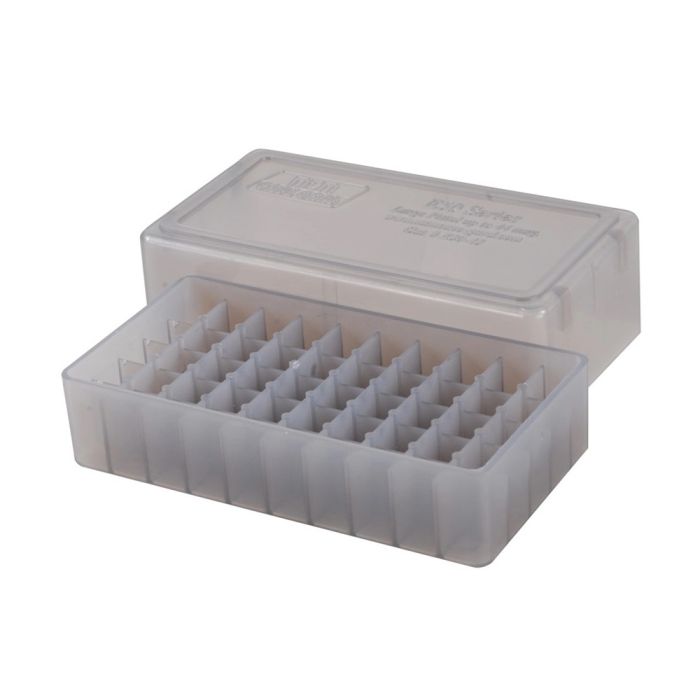 MTM Case Gard E50 Series #E-50-45-41 Smoke, munitiedoos voor 50 patronen, kaliber .45Long Colt, .45 Auto, .44 Magnum, .44 Special. MTM Ammobox Case Gard E-50-45-41 Large Pistol up to .44 Magnum. De bekende MTM munitiedozen RM-Series zijn gemaakt van duurzaam polypropyleen kunststof. Ideaal voor het opslaan van herladen en fabrieks-munitie. Ze hebben een goede grip door de gestructureerde oppervlak en zijn stapelbaar.