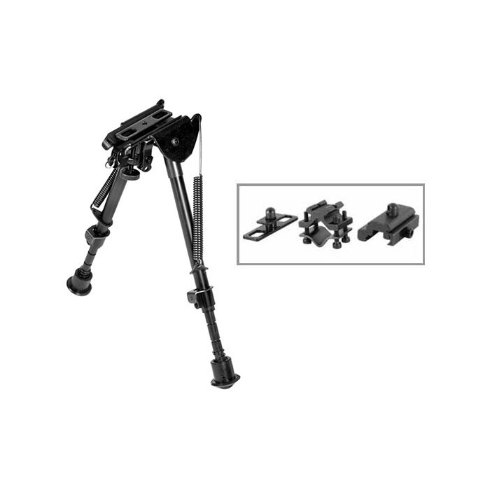 NC STAR Bipod. Bipods van NC Star klemt men op een zeer eenvoudige wijze aan een Quick Detachable Stud onderaan het voorhout. Solide tweepoot door het gebruik van vliegtuig aluminium en staallegeringen. Met krachtige veer-werking om de benen uit te klappen voor een zeer stevige en stabiele ondersteuning. Door-middel van de retention knop vergrendeld men de pootjes op de gewenste lengte en door een lichte druk op de knop trekken de pootjes door veer-spanning automatisch terug op zijn plaats. Rubber voetjes zorgen voor extra stabiliteit tegen uitglijden. Full Size Model "Notched" met een verstelbare hoogte van 7 tot 11 inch (17,5-27,5 cm). Inclusief 3 adapters: AR-15 Hand Guard adapter, Universeel Loop montage ,en een Weaver / Picatinny Rail met Sling Stud.