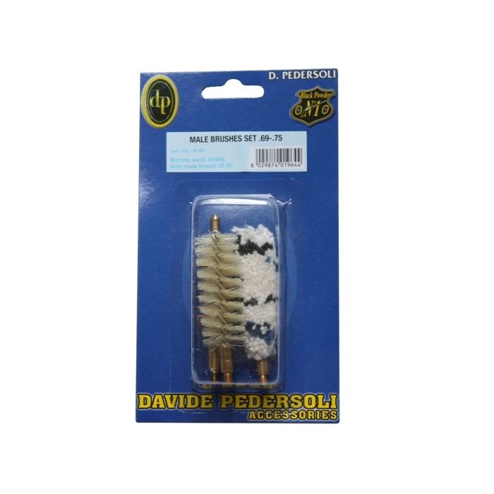Pedersoli driedelig borstelset, kaliber .69/.75. De set bestaat uit 1 x bronsborstel, 1 x nylonborstel en 1 x wolborstel. Uiterst geschikt voor het reinigen van zwartkruitwapens. Voorzien van 10/32 (Male) schroefdraad voor aansluiting op Pedersoli poetsstokken.