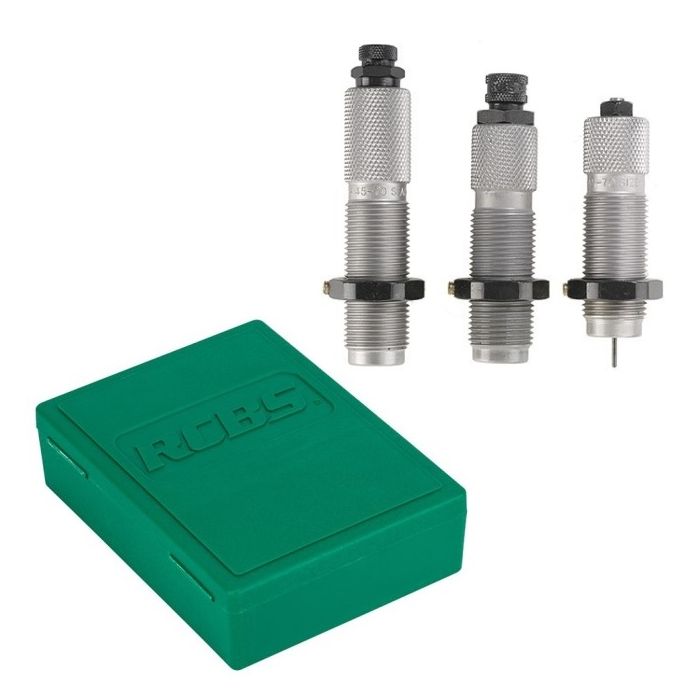 RCBS drie-delige steel matrijzen-set. De set bestaat uit een full-length (Straight Wall) kalibreer-matrijs (met decapping gedeelte), Expander Die voor het licht op-wijden van de hulsmond en een kogel-zet matrijs. De Full-Length Sizer Die kalibreert de huls terug naar fabrieks afmetingen. De Headspace wordt aan minimale toleranties gehouden tijdens het kalibreren om te voorkomen dat de volledige lengte-maatvoering van de huls wordt verandert. De kalibreer-matrijs heeft een ventilatieopening om schade aan de huls te voorkomen, veroorzaakt door ingesloten lucht en/of overmatige smeermiddel. De kogel zet-matrijs is voorzien van een ingebouwde Roll krimp voor het stevig vasthouden van de kogelpunt.Bij deze type Die's is het nodig om de hulzen te vetten voor het kalibreren. RCBS matrijzen-sets worden zonder hulzenhouder geleverd.