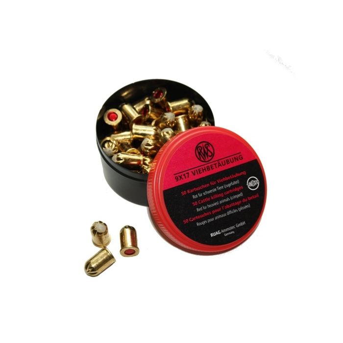 RWS, slachtpatroon kaliber 9x17 (viehbetäubung). Kleur rood voor de zwaarste dieren. De RWS slachtpatroon is enkel en alleen bedoeld voor het gebruik in de daarvoor bestemde schietmaskers.