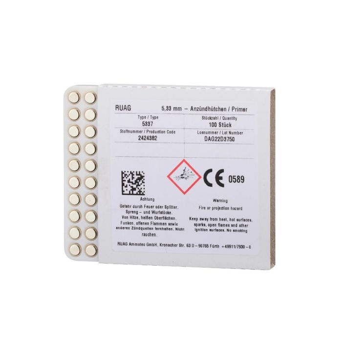 Slaghoedjes Large Pistol van RWS - Ruag. Boxerprimer large pistol voor pistool en revolver patronen, diameter 5,33 mm. 1000 stuks per verpakking. De RWS 5337 Large Pistol primers worden ontworpen aan veeleisende kwaliteitstesten. De RWS slaghoedjes worden geproduceerd op een ultramoderne productiefaciliteit die enkele jaren geleden is geïnstalleerd in de RWS fabriek. De productie bestaat uit het stansen, het trekken van de beker, het vormen van de primer, het drogen en persen van de slagsas en het inpersen van het aambeeld, vergezeld door geïntegreerde, automatische kwaliteitscontroles. De RWS LP type 5337 zijn speciaal ontwikkeld voor pistool en revolerpatroon.