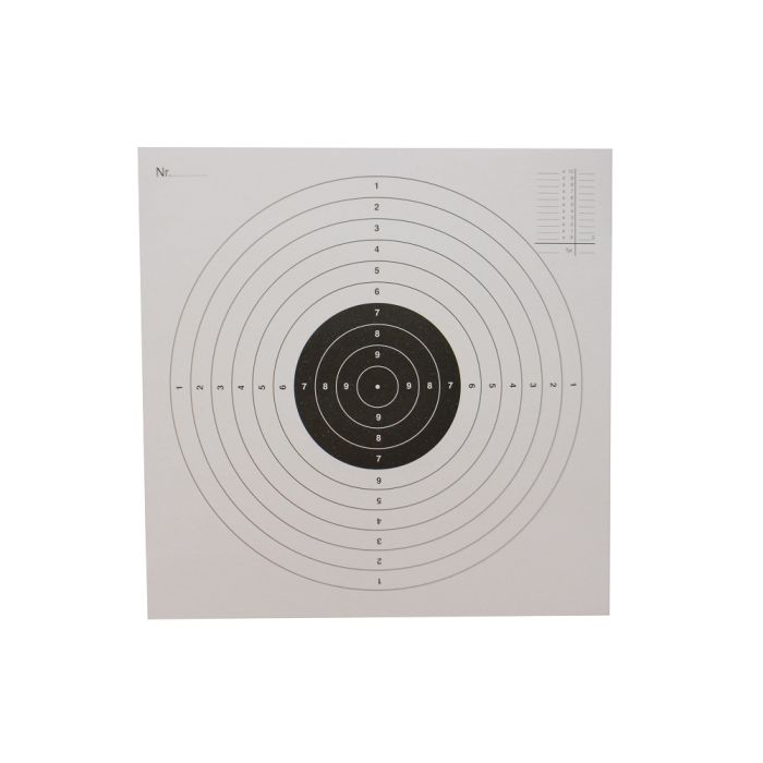 Kartonnen schietkaarten, maat 23×23 centimeter voor gebruik in de sterke metalen kogelvanger 23x23 centimeter. Puntentelling tot 10. De tien heeft een doorsnede van 20 mm. Stevige en duidelijke schietkaarten voor het recreatief schieten met de luchtbuks of persluchtgeweer in de tuin over langere afstand.