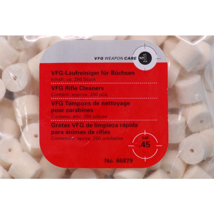 VFG loop reinigings viltjes zijn gemaakt van puur wolvilt en worden gebruikt voor de eindschoonmaak, in-oliën en ontvetten van de loop. De wol-viltjes zijn een fractie groter dan de diameter van de trekken en velden van de loop, waardoor het vilt-propje goed en optimaal aangedrukt door de loop geduwd wordt en tegelijkertijd volledig al het vuil verwijderd. De cilinder vormige vilt-proppen zijn voorzien van een centraal gat. Men draait 2 vilt proppen op de VFG adapter waarvan de eerste prop goed dient te worden vastgeschroefd en de tweede losjes over het schroefdraad met daarop alvast een paar druppels wapenolie. De eerste prop zal het meeste vuil verwijderen en uit de loop de drukken. Bij het terughalen van de pompstok zal de voorste prop eraf vallen waarna de andere prop het laatste vuil uit de loop verwijderd.