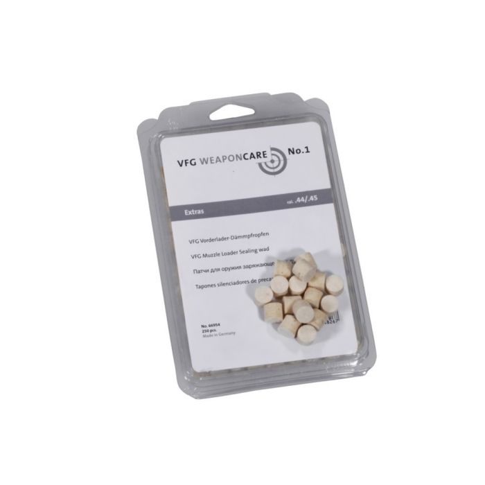 VFG Voorlaad-Dämmpfropfen voor kaliber .44 /.45 zijn gemaakt van zuivere wol-vilt, niet gevet. Met een constante diameter voorkomen de VFG Dämmpfropfen niet alleen gas-lekkage tussen de kogel en loopwand maar hebben ze ook een reinigende werking tijdens het schot.